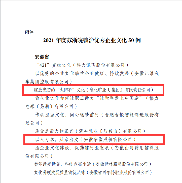 “2021 年度苏浙皖赣沪优秀企业文化 50 例”中,安徽省十家单位“榜上有名”。淮北矿业集团“绽放光芒的‘太阳石’”文化”与yd2333云顶电子游戏股份公司“以人为本,从家出发”企业文化品牌与省内各大知名品牌企业名列“榜单”。