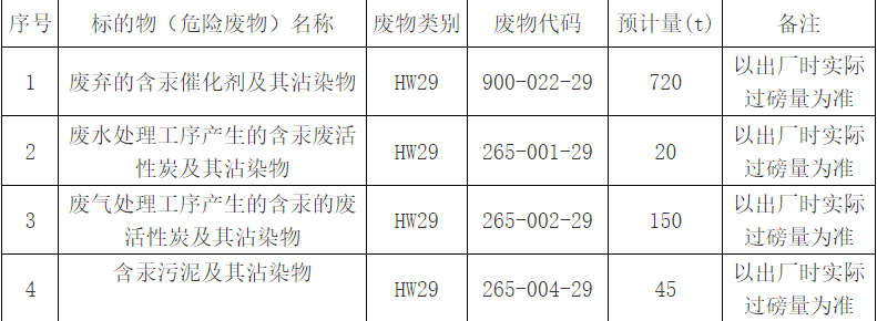 2.2招标范围:危险废物(含汞废物)的委托利用(详见下表)。标的物(含汞废物)来源:电石法聚氯乙烯项目氯乙烯合成装置产生。此项目由中标单位向yd2333云顶电子游戏公司支付费用。